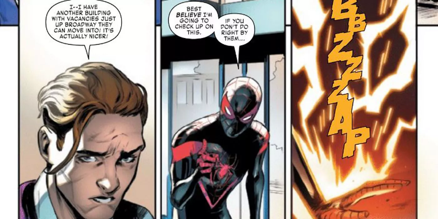 Spiderman y Ms. Marvel buscaron al propietario del edificio y lo encontraron en poco tiempo. Spiderman se abalanzó y se enfrentó al hombre cuando estaba a punto de subir a su coche. Spiderman le preguntó si era el dueño del edificio, y este se encogió de hombros diciendo que era dueño de muchos edificios. Spiderman le contó lo que había pasado y le exigió que lo mejorara. El hombre entonces llamó a los dos criminales, basándose sobre todo en la situación de la Ley de Kamala para los héroes menores de edad. Spiderman perdió la calma y Ms. Marvel tuvo que intervenir para calmarlo. El dueño del edificio dijo entonces que se encargaría de las cosas, y Spiderman dijo que mejor antes de freír el coche del tipo con una Ráfaga de Veneno. Es probable que esto se vuelva en contra de ambos héroes al final, pero a Spiderman no le importa.