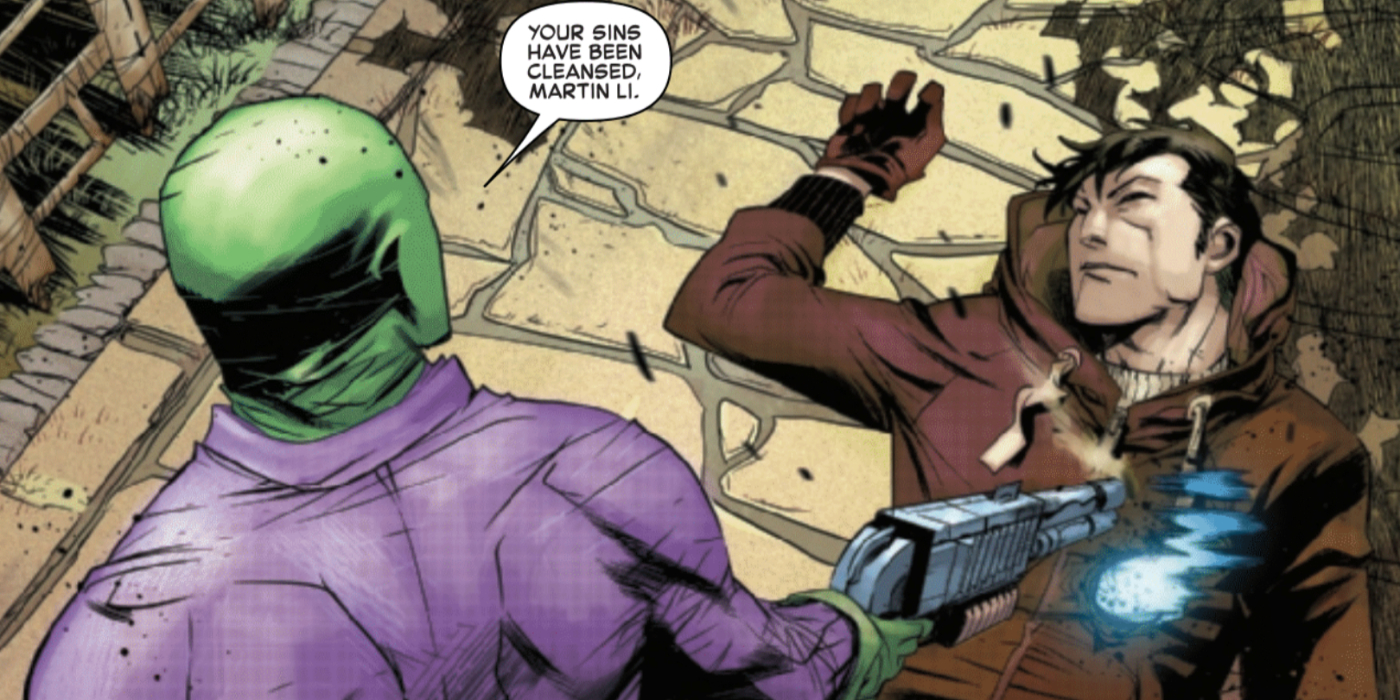 Empieza ahora.Esto nos lleva a un interesante desarrollo en Amazing Spider-Man: The Sins of Norman Osborn #1. Mientras reza, un hombre encapuchado se acerca al Devorador de Pecados y huye de una reunión anterior de los partidarios del Devorador de Pecados cuando Spiderman la interrumpió. El hombre misterioso pidió ser absuelto de sus pecados y ser libre de su maldición. Aceptando, pero primero exigiendo al hombre que se quitara la capucha, el Devorador de Pecados sólo se rió cuando vio la cara recién revelada. Sin dudarlo ni un momento, el Devorador de Pecados disparó al "penitente" que se reveló ser nada menos que Martin Li, alias Mister Negativo. Declarando que estaba absuelto de sus pecados, el Devorador de Pecados dejó al inconsciente a Martin, armado con sus poderes de corrupción para ayudar en su cruzada.