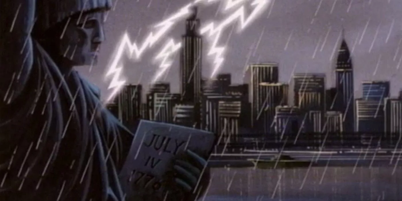 Empieza ahora.Después de los créditos iniciales de "Triunfo del Duende Verde", el primer disparo se centra en la icónica Estatua de la Libertad de pie y sosteniendo un libro que dice, "Julio IV, 1776", la fecha en que se firmó la Declaración de Independencia de América. Mientras que el 4 de julio de 1776 es la fecha correcta, la verdadera Estatua de la Libertad usa números romanos para el año, que dicen "Julio IV, MDCCLXXVI".