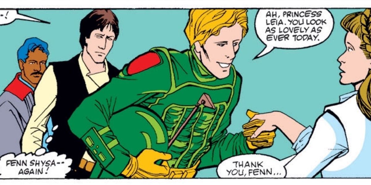 Fenn Shysa apareció por primera vez en los viejos cómics de Star Wars de Marvel de los años 80 y ya ha sido descifrada y re-canonizada, ya que gran parte de esos viejos cómics no se consideraban exactamente canon del UE. Shysa era una mandaloriana enamorada de Leia y ayudó a liberar el planeta de los imperiales en los cómics.