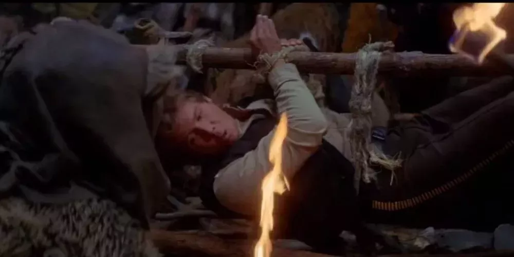 Al principio, a Solo no le gusta que lo capturen, pero al cabo de un rato, a regañadientes, se encariña con ellos y acepta a los ewoks y su ayuda. Ver a Han intentando seguir siendo un gruñón mientras el ewok le abraza la pierna es tan bonito como entrañable.