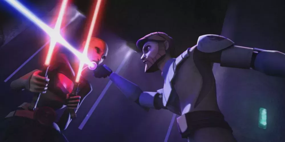 Dicho esto, se puede decir que la lucha fue mejor que el primer encuentro de Anakin y Obi-Wan con el conde. Los dos Jedi se pusieron de acuerdo para atacarle al mismo tiempo y mantuvieron a Dooku a la defensiva. Sin embargo, finalmente sacó a Obi-Wan de la pelea empujándolo a la fuerza hacia un balcón antes de derrumbarlo.