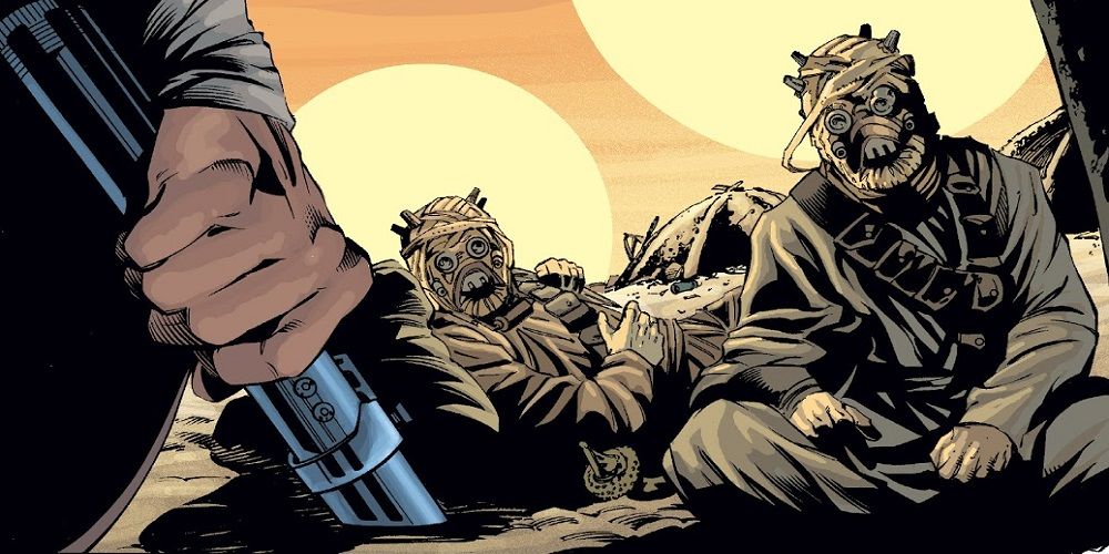 En La Guerra de las Galaxias: Episodio II - El Ataque de los Clones #3, Anakin se entera de que su madre fue secuestrada por los Invasores de Colmillos mientras recogía hongos. Su padrastro (el hombre que primero tomó a su madre como esclava antes de liberarla y casarse con ella) dice que probablemente ya esté muerta, pero Anakin todavía puede sentir su dolor. Así que Anakin va al campamento de los Tusken Raiders y ataca, matando a toda la aldea de Tusken (después de encontrar a su madre y tenerla en sus brazos mientras muere).