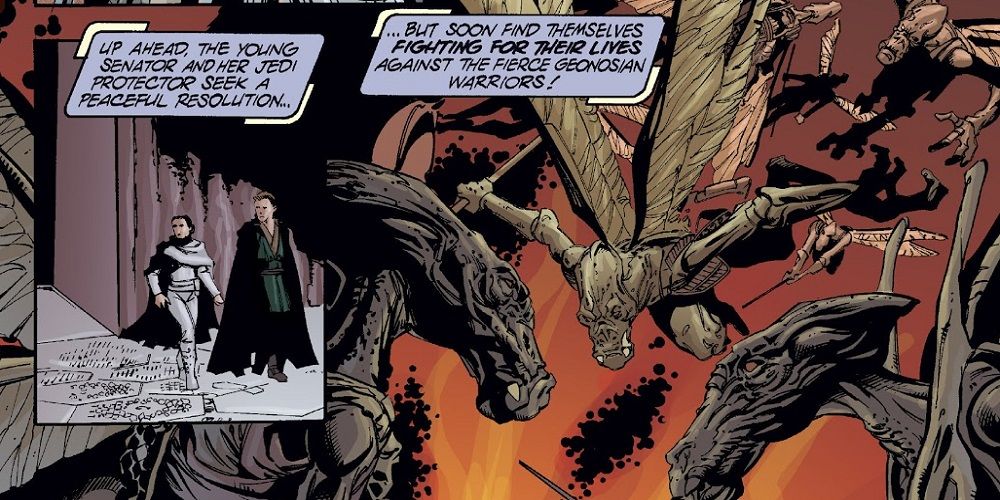 En La Guerra de las Galaxias: Episodio II - Ataque de los Clones #3 Anakin recibe la noticia de que se están gestando problemas en Geonosis, y en lugar de escuchar las órdenes del Maestro Windu de quedarse en su sitio y proteger a Padme, Padme le obliga a viajar a Geonosis para intentar salvar la vida de Obi-Wan (donde parece que Obi-Wan fue emboscado por droides mientras enviaba su mensaje holográfico). Padme y Anakin llegan al centro de una fundición de droides e inmediatamente se encuentran con oposición. Los guerreros geonosianos atacan contra ellos, y Anakin se separa de Padme en la lucha.