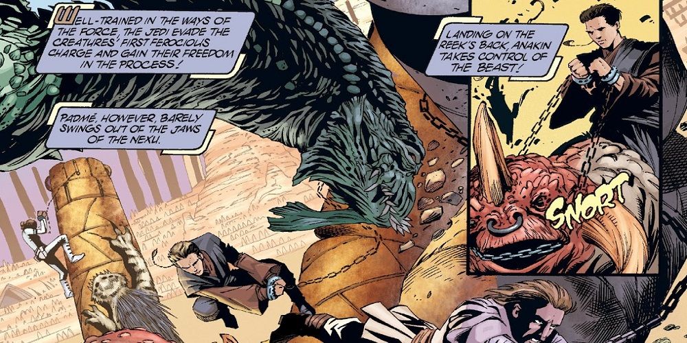 En La Guerra de las Galaxias: Episodio II - Ataque de los Clones #4, Anakin y Padme son juzgados en Geonosis y son encontrados culpables de espionaje. Padme le dice al Archiduque que está cometiendo un acto de guerra al hacer que ella y Anakin sean juzgados, y son llevados a la arena donde serán asesinados mientras están encadenados. Padme y Anakin confiesan su amor mutuo, y cuando los guardias no miran, Padme saca un trozo de alambre de su boca y comienza a abrir el candado de sus cadenas. Obi-Wan, ya encadenado a la alcoba de la arena, dice que se preguntaba si Anakin había recibido su mensaje, y Anakin le responde que sí y decidió venir de todas formas (como Obi-Wan dijo que no viniera pero quería que lo hiciera). Mientras las bestias mortales son liberadas en la arena, Padme abre sus cadenas y se sube a un poste. Anakin y Obi-Wan luchan por sus vidas y logran salir.