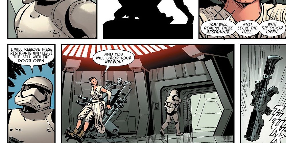 El sable láser resulta ser el que perteneció a Luke Skywalker y a su padre antes que él. Y cuando a Rey le dicen que el sable de luz la llama, ella niega la llamada y sale corriendo. Después de ser llevada a la fuerza al cuartel general de la Primera Orden en el número 4, en el número 5 usa sus fuertes poderes de control mental para ordenar a un guardia de la Primera Orden que la desate y deje la puerta abierta. El guardia de la Primera Orden hace exactamente lo que ella dice y deja su arma a su disposición también. Para cuando Kylo Ren venga a llevarla con su maestro, no la encontrará en ningún lado.