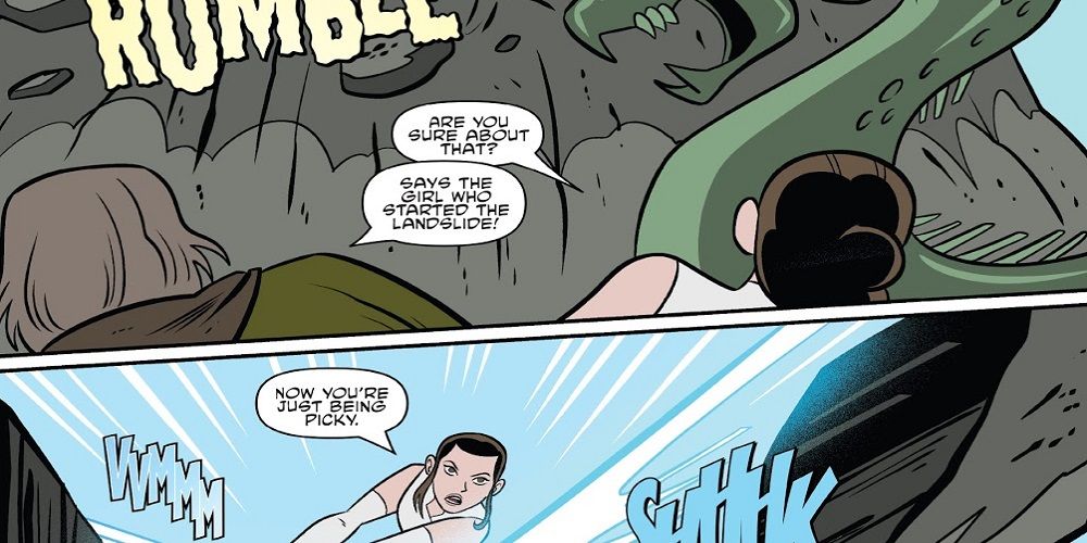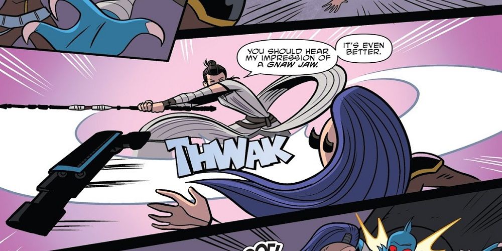 En Star Wars Adventures (2017) #26 Rey está siendo entrenado por Luke Skywalker. Es una sabelotodo arrogante, tratando de demostrar cuánto sabe, en lugar de dejar que La Fuerza esté con ella. En su búsqueda por probar cuán fuerte y poderosa es, Rey usa la Fuerza para levantar una roca gigante en el agua y lo hace pero perturba a una criatura marina en el proceso. La ataca y la golpea contra la montaña y causa un deslizamiento de tierra. Resulta que la serpiente marina se enojó porque Rey perturbó su nido de bebés. Así que Rey tiene que someter a la enorme serpiente mientras Luke Skywalker y Chewie cubren el nido de nuevo.