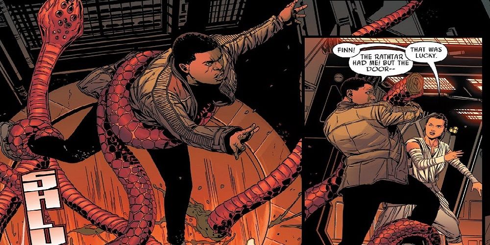 En La Guerra de las Galaxias: La Fuerza Despierta la Adaptación #3, Finn, BB-8, y Rey están a bordo de un viejo carguero de basura que resulta ser nada menos que el Halcón Milenario de Han Solo y Chewie. Poco después de que Han Solo y Chewie suben al barco que llaman hogar, los usureros suben a bordo exigiendo que Han Solo pague los créditos que le debe a él y a otros, o que muera por ello. Vienen con un enorme monstruo rojo que comienza a perseguirlos por los pasillos del barco e incluso a través de una trampilla. Agarra a Finn y a Rey con sus tentáculos, pero Rey se las arregla para liberarse y correr a los controles para usar las puertas explosivas para liberar a Finn de las garras del monstruo.