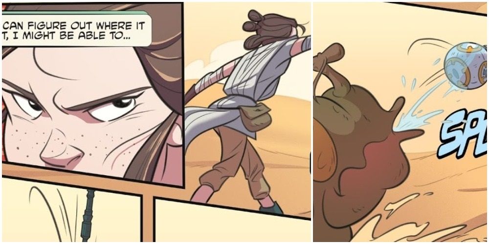 En Star Wars: The Force Awakens Adaptation (2016) los lectores del número 1 conocen a Rey, que cambia partes por porciones de comida. Cuando encuentra un droide atrapado en una red y lo salva, se le pega. Sin embargo, el general Hux, un malvado oficial de la Primera Orden, pronto recibe la orden de agarrar al BB-8 y llevárselo a su amo.