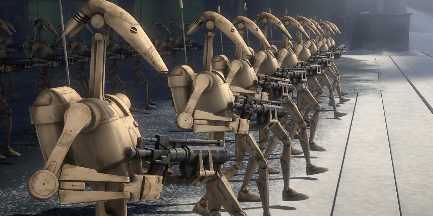 Individualmente, los droides de batalla son algo patéticos, pero los ejércitos de ellos eran bastante peligrosos, y Anakin nunca dudó en lanzarse contra grupos masivos de droides. Hay una razón por la que sus clones respetaban tanto a Anakin: nunca les pedía que hicieran cosas que él no haría.