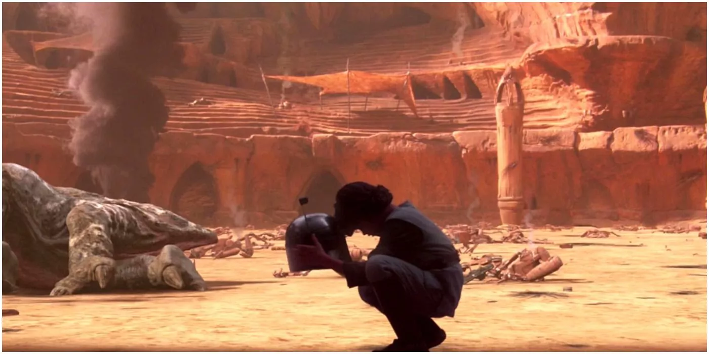 Cuando Anakin regresó a las desoladas dunas de Tatooine, buscó la casa de la familia Lars y descubrió con horror que los Asaltantes Tusken habían secuestrado a Shmi Skywalker y la habían arrastrado hasta su campamento, probablemente para torturarla. Desesperado, Anakin se montó en una moto veloz y encontró el campamento. Entró en una tienda de campaña y encontró a su madre moribunda, y lloró mientras ella moría a causa de sus heridas.