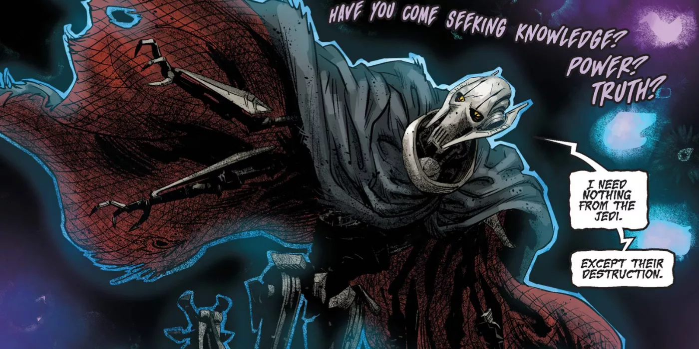 En el número, Grievous entró en un antiguo templo Jedi, donde fue recibido por la voz de una poderosa entidad de la Fuerza. Sus cibernéticos fueron despojados, revelando a la persona que una vez fue, alguien que tenía mucho más en común con los Jedi de lo que nunca quiso admitir.