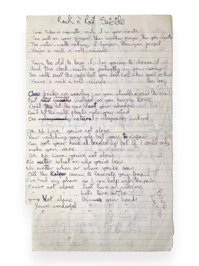 Los documentos, que se pondrán a la venta la próxima semana, contienen las correcciones, borradores y notas del fallecido cantante sobre sus temas "Rock 'n' Roll Suicide" y "Suffragette City". Ambas aparecen en su álbum seminal de 1972, "The Rise and Fall of Ziggy Stardust and the Spiders from Mars".