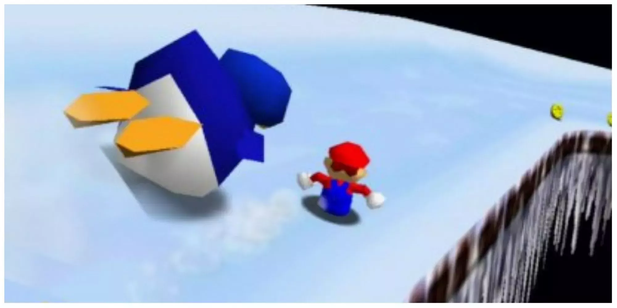 El pingüino es legítimamente rápido y tiene una IA de banda elástica, lo que significa que siempre estará detrás del jugador independientemente de la distancia que lleve. Puede deslizarse delante de Mario en cualquier momento y arruinar la carrera del jugador. El tobogán también tiene algunos giros pronunciados, que pueden hacer que el jugador se caiga fácilmente. La estrella es la primera llamada de atención real del juego, y el pingüino conlleva más dificultad después de terminar el juego al 100%.