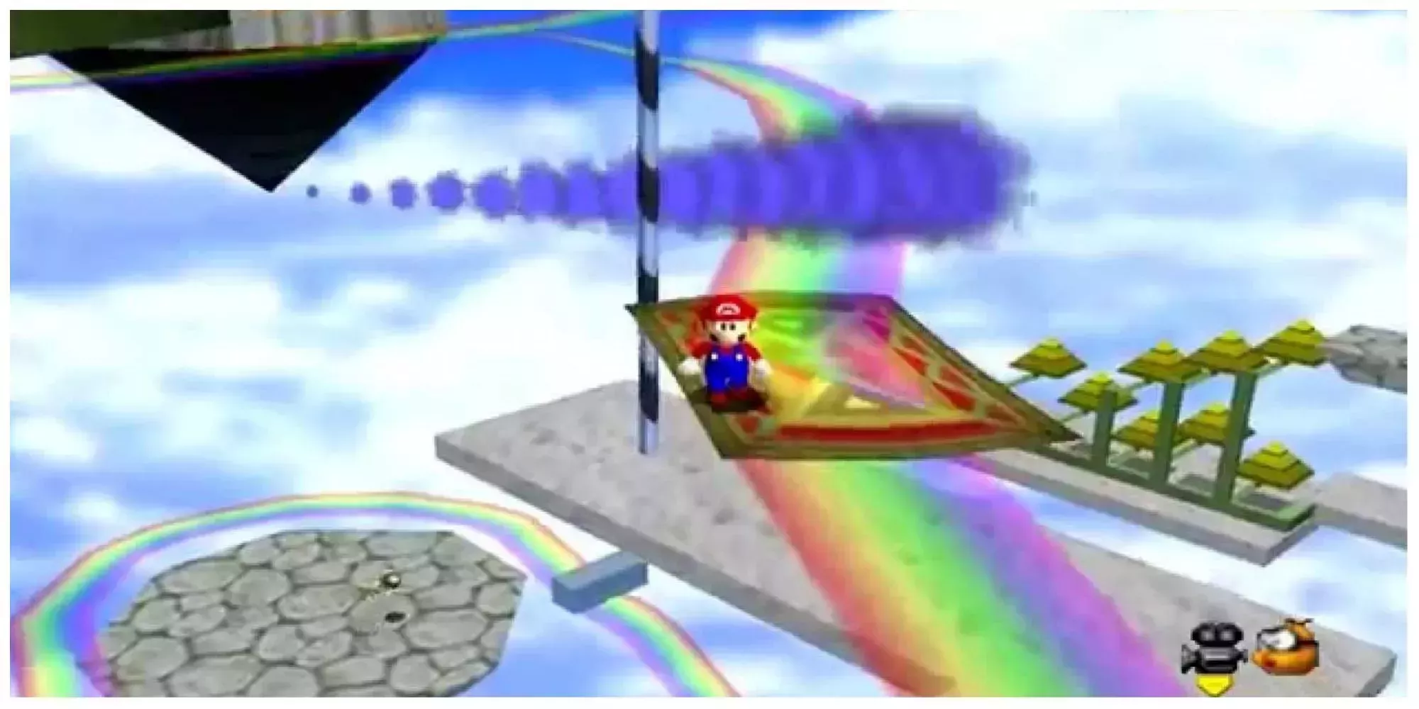El jugador sólo puede llegar a la nave a través de una serie de alfombras mágicas, y el camino hacia las estrellas tiene varios obstáculos que requieren que los jugadores salten repetidamente sobre ellos y los abandonen. Si te mantienes alejado de las alfombras durante demasiado tiempo, éstas pueden desaparecer y no dejar que llegues a la nave. Incluso después de llegar a la nave, la dificultad no disminuye. Las plataformas inestables y los fuertes vientos alejan a Mario de la estrella.