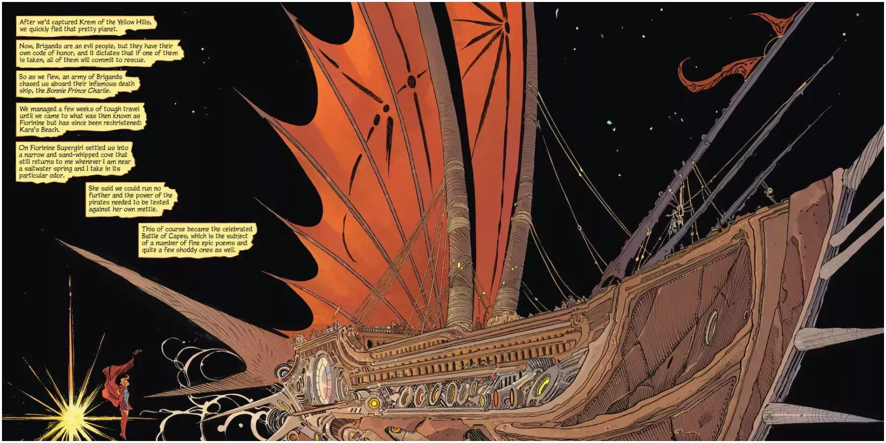 En el número siete, Supergirl ataca finalmente a los piratas espaciales. En lugar de una nave espacial clásica de ciencia ficción, los piratas espaciales están en una nave que recuerda a las que surcaban el Caribe en el siglo XVIII, hasta sus cañones que disparan proyectiles de alta tecnología. Evely le da un aspecto asombroso, un gran elemento visual que destaca en un libro lleno de elementos destacados.