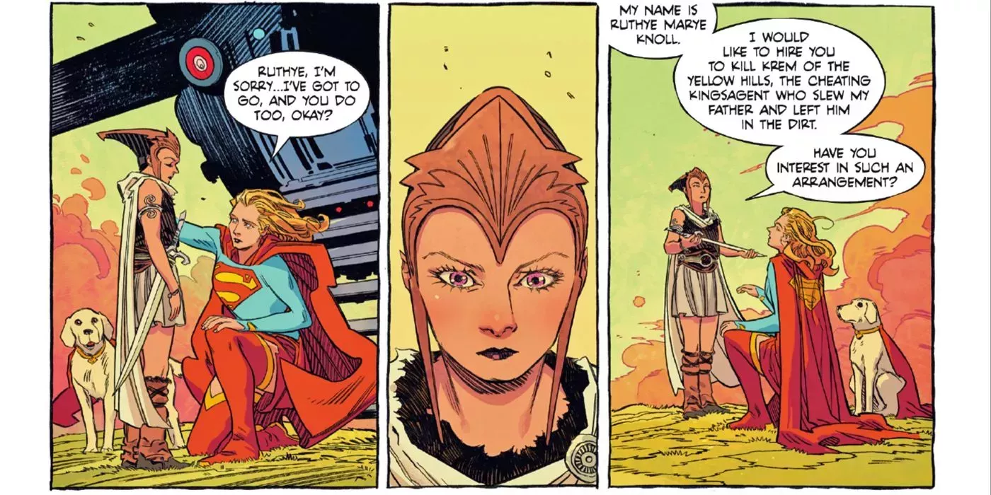 Aunque el cómic dice Supergirl en la portada, en realidad es la historia de la chica que conoce en el primer número, Ruthye. Ella es el personaje en perspectiva, y la mayor parte del primer número se dedica a dar a los lectores su vida e historia, estableciendo por qué quiere la ayuda de Supergirl en primer lugar. Deja su mundo natal junto a Kara, y es la ventana del lector a los extraños mundos que atraviesan en su búsqueda de Krem.