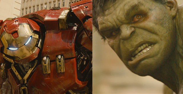 Marvel studios desvela la escena de 'los vengadores 2' con la armadura hulkbuster contra hulk... iron man parece llevar ventaja, hasta que hulk empala su hombro...