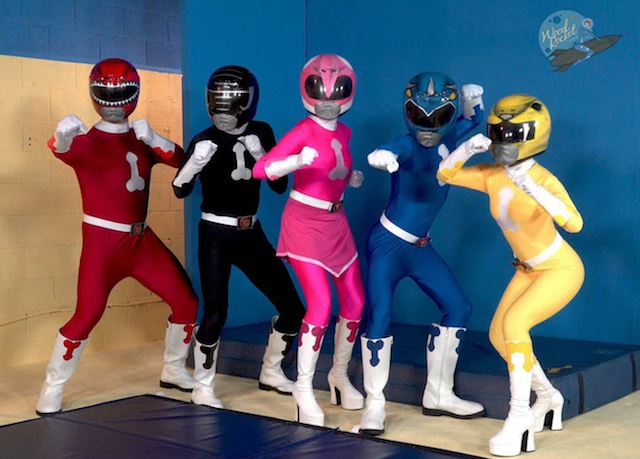 Los power rangers originales en su rol de power ranger rojo, power ranger amarilla, power ranger azul, power ranger rosa y power ranger negro...