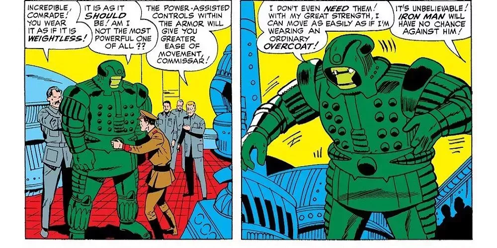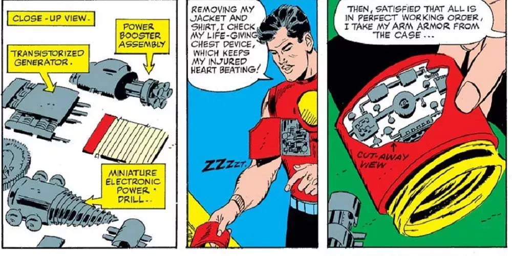 La tecnología era toda ciencia de cómic, con la armadura ajustándose a Stark como si fuera ropa hasta que se polarizaba adecuadamente y se volvía dura como una armadura. Stane Lee y Don Heck incluso crearon un minicómic entero mostrando el proceso de blindaje en Tales of Suspense #56, explicando exactamente cómo funcionaba todo.