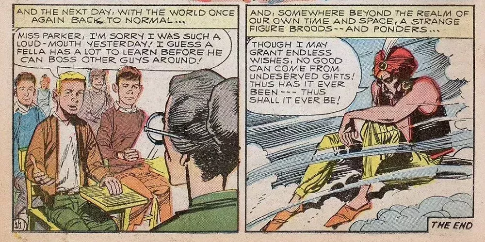 Pero Tales of Suspense era un libro que se prestaba a ello, ya que no tenía una lista rotativa de protagonistas para llenar las páginas. El número anterior al debut de Iron Man trataba sobre un grupo de niños que descubrían un genio, sólo para descubrir que cada deseo que concedían empeoraba el planeta.