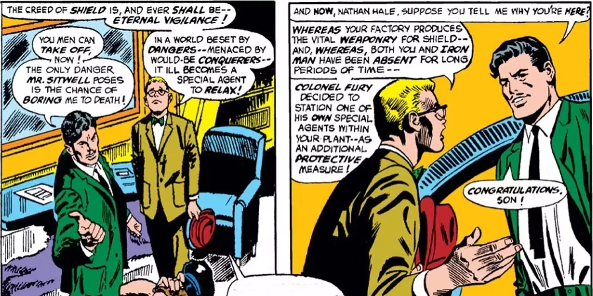 En Tales of Suspense #95, de Stan Lee y Gene Colan, Iron Man se relacionó con el enlace de SHIELD Jasper Sitwell, que servía como guardaespaldas secundario de Tony Stark. La conexión de Stark con SHIELD se mantuvo hasta que dejó de construir armas para ellos a finales de los 70. Tras un intento fallido de hacerse con Industrias Stark, Nick Fury y SHIELD se retiraron de los asuntos de Stark.