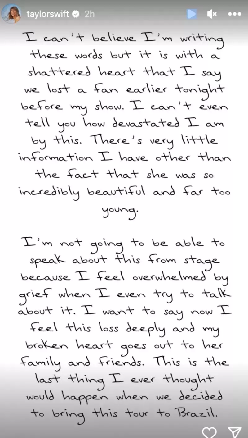 A través de Instagram, Swift compartió el siguiente comunicado: "No puedo creer que esté escribiendo estas palabras, pero es con el corazón destrozado que digo que hemos perdido a un fan esta noche antes de mi show. No puedo expresar lo devastada que estoy por esto.