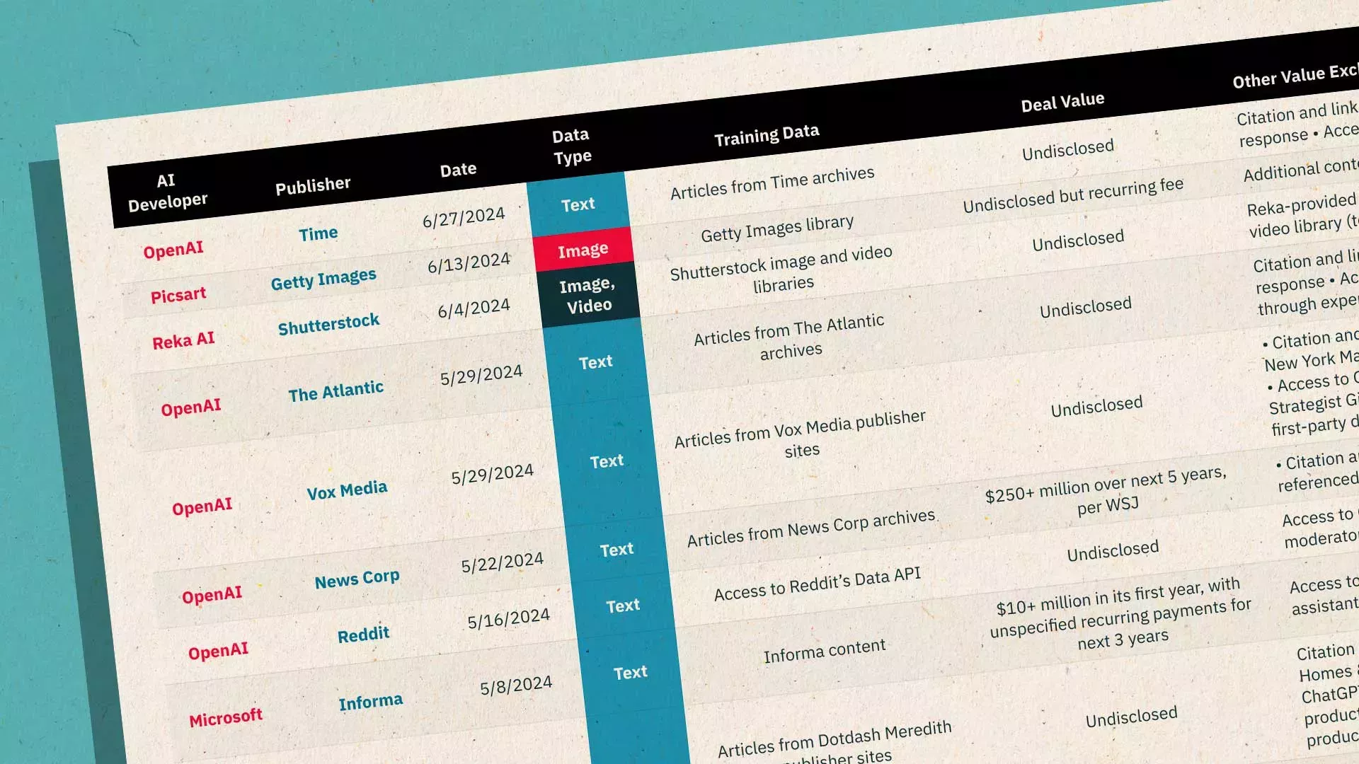 VIP<a href="https://variety.com/vip/breaking-down-ai-content-licensing-all-the-publisher-deals-training-ai-models-1236093395/" class="c-title__link lrv-a-unstyle-link a-content-ignore">Acuerdos de licencia de contenidos de AI con editores: Índice completo actualizado