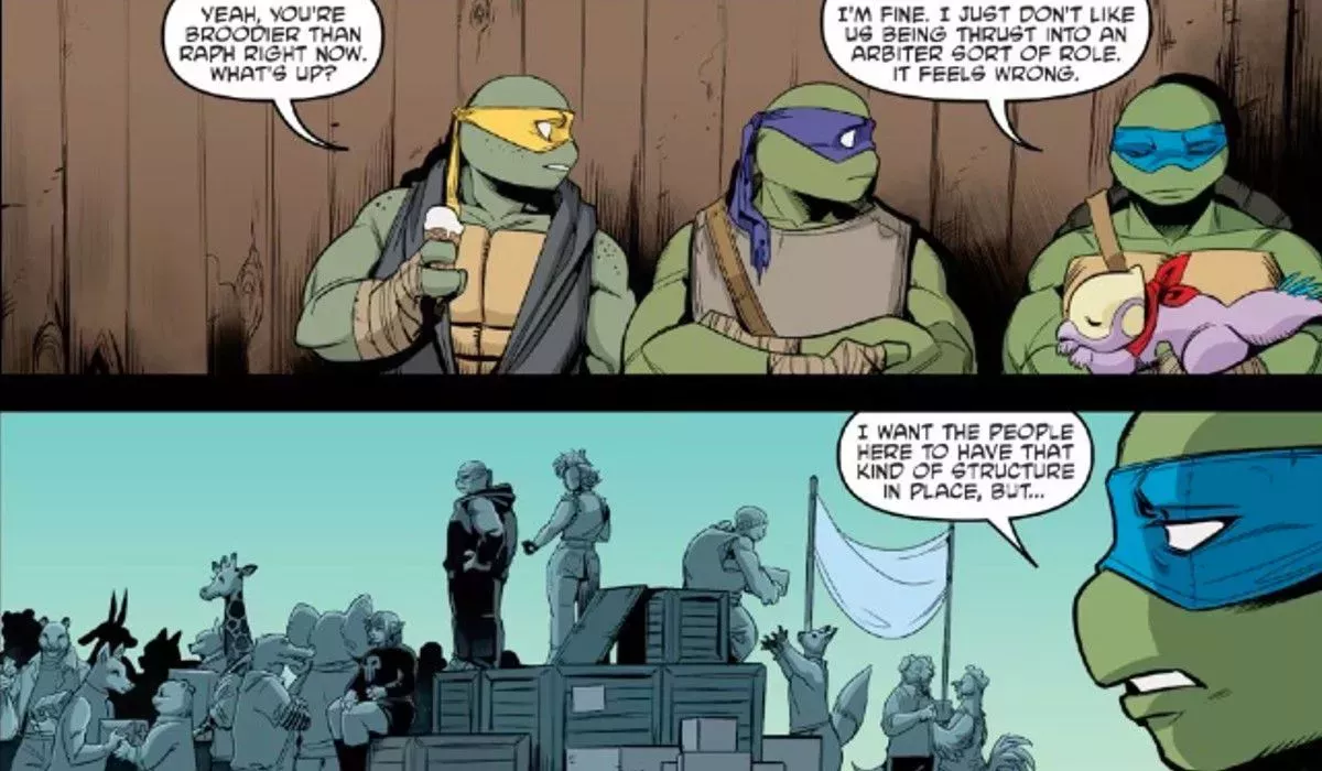 Ahora que los Mutanimals ya no son una amenaza para Ciudad Mutante, las Tortugas y sus aliados pueden ponerse a trabajar en la redistribución de sus reservas de alimentos y medicinas, así como en la reconversión de su sede en un nuevo ayuntamiento. Por muy monumentales que sean estas tareas, son sólo el comienzo de una nueva era para Ciudad Mutante, que requerirá aún más trabajo del que ya han asumido los héroes. Mientras reparten provisiones a los ciudadanos de Ciudad Mutante, Jennika y Donatello se fijan en la inusual melancolía de Leonardo durante lo que debería ser una ocasión feliz. No es que su estado de ánimo se haya deteriorado por lo que está ocurriendo ahora, sino por saber que él y el resto de las Tortugas no pueden hacer nada más en el futuro, al menos no de forma oficial.