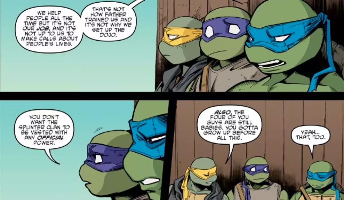Además de todo lo anterior, Jennika señala que las otras Tortugas son todavía demasiado jóvenes para asumir ese grado de responsabilidad oficial, proporcionando con humor otra razón para que el Clan Splinter se mantenga alejado de asumir una posición de autoridad.