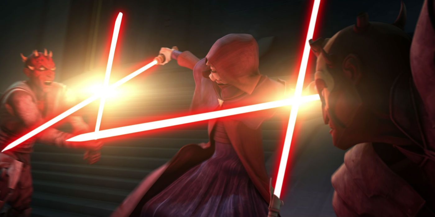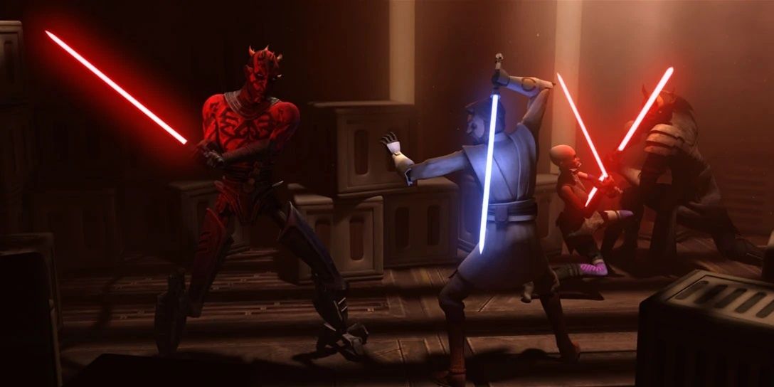 Los fans saben que pueden esperar grandes cosas cada vez que Obi-Wan Kenobi y Darth Maul aparecen en la misma escena. El hermano de Maul, Savage Opress, y la antigua asesina Sith, Asajj Ventress, se mezclan para una acción de dos contra dos que resulta ser una combinación hecha en el cielo de Star Wars .