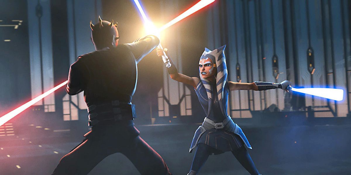 El último duelo de sables láser de la serie es posiblemente también el mejor. Desde su primer enfrentamiento en pantalla en Star Wars Rebels, los fans habían pedido más acción entre Ahsoka y Maul. La esperada séptima temporada de The Clone Wars cumplió con estas peticiones de forma rotunda. Los dos favoritos de los fans tuvieron un duelo extraordinario y bellamente coreografiado, tanto en la sala del trono como en las vigas de soporte de la cúpula de la ciudad. Los espectadores pudieron sentir fácilmente la tensión de esta escena con todo lo que estaba en juego, aunque probablemente conocieran la trama de La venganza de los Sith. Esto demuestra lo brillante que es la escena y lo magnífica que puede ser Star Wars .