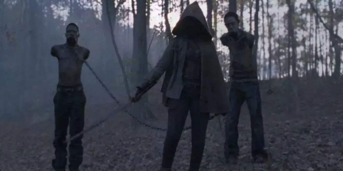 Los Susurradores tienen a la pareja rodeada, y Alfa entonces blande su arma y suelta una de las mejores primeras líneas de la serie a través de su máscara: "El rastro termina aquí". Estaba claro que The Walking Dead había evolucionado al tiempo que volvía a sus raíces de terror, para alegría de los fans.