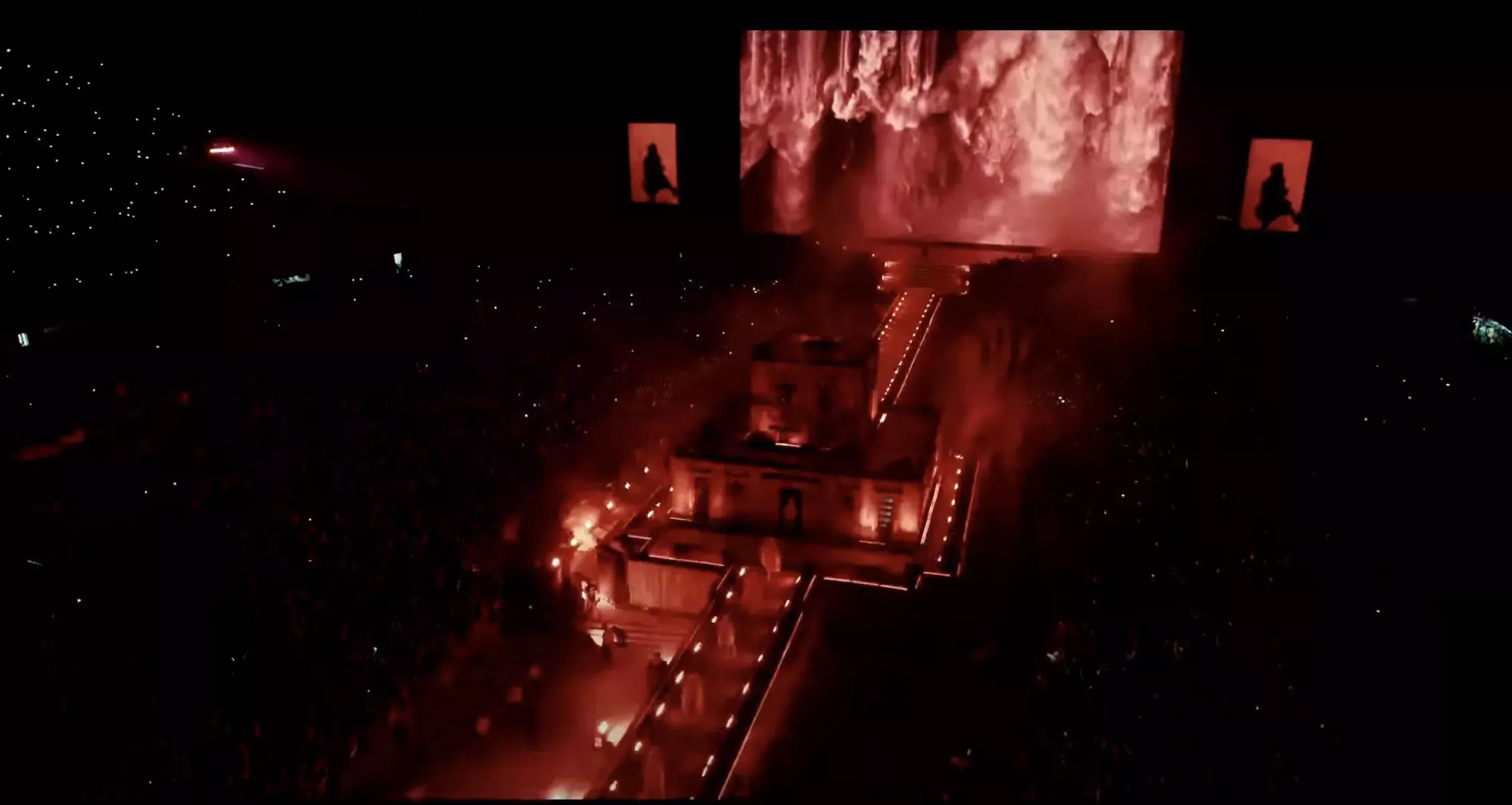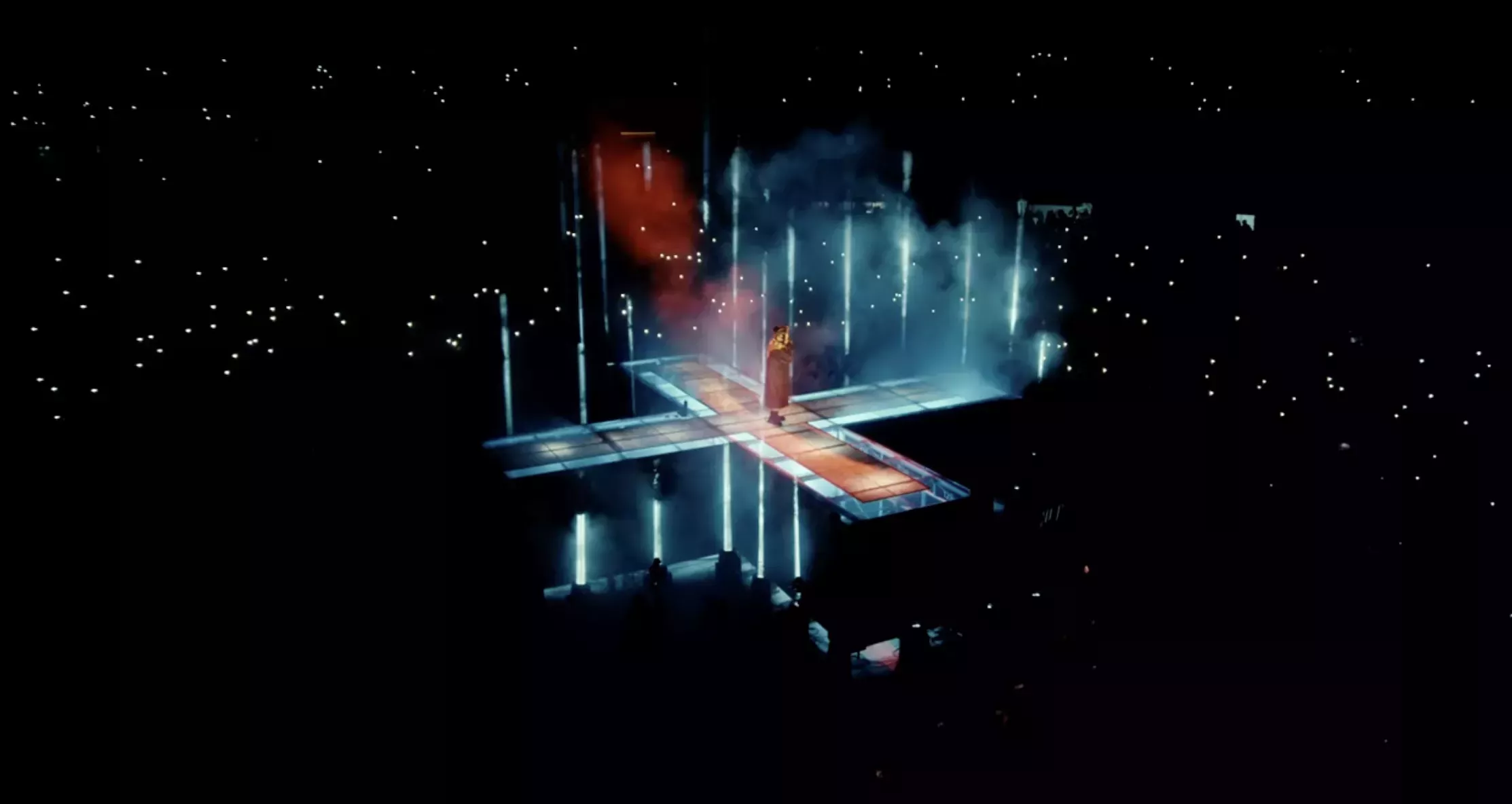 El espectáculo de la noche fue básicamente una evolución del concierto "After Hours Til Dawn" que llevó a Norteamérica en 2022 y, en una forma actualizada, a Europa el año pasado: una enorme pasarela iluminada, casi como una pista de aterrizaje de un aeropuerto, que se extendÃa de un extremo a otro de la pista del estadio, pero con un gigantesco edificio de dos plantas en el centro, parecido a un templo, y un escenario iluminado en forma de cruz en el extremo opuesto de la pasarela desde la pantalla de vÃdeo.