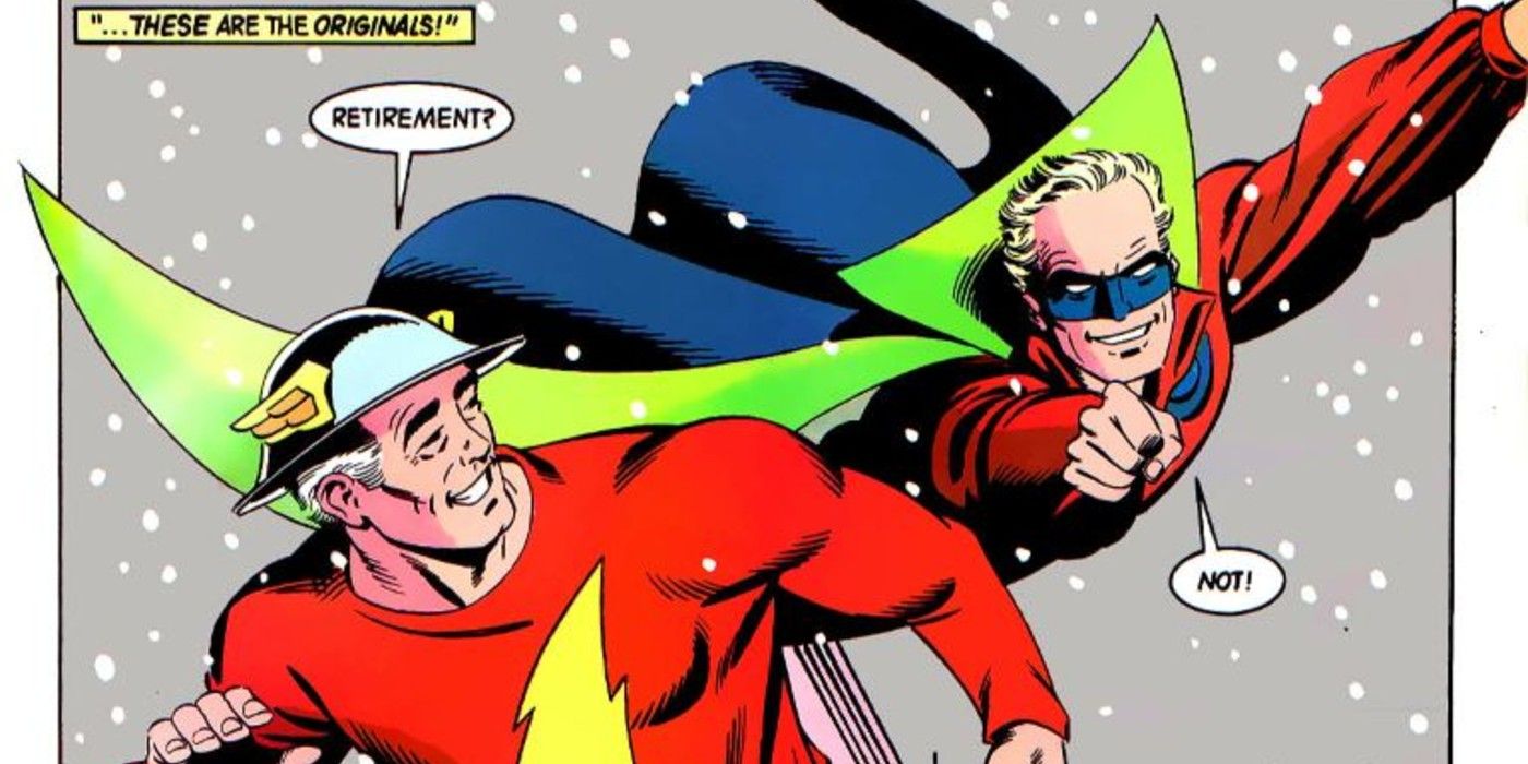 El Flash original, Jay Garrick y Hawkman eran de All-American Publications, mientras que Spectre y Hour-Man eran ambos héroes tomados de National Comics, todos los cuales aparecieron en estas historias iniciales.