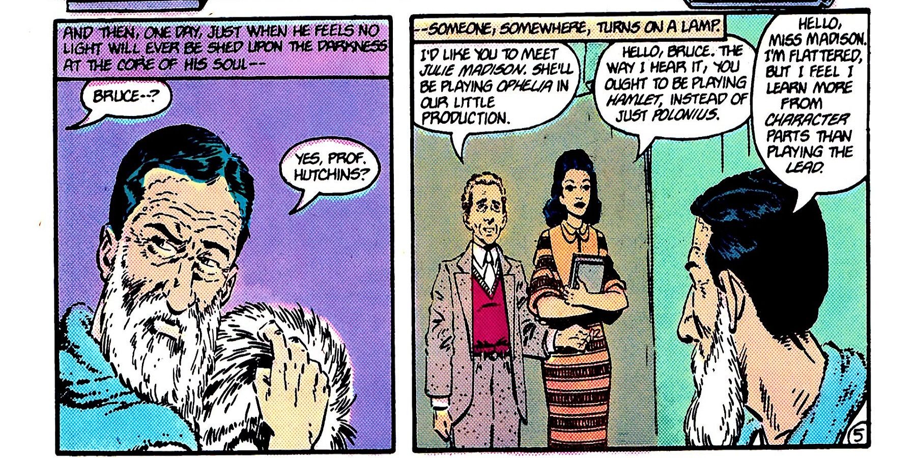 Bruce fue a la universidad, donde sobresalió en todas sus clases, mientras que continuó entrenando para algo sin darse cuenta de cuál era el objetivo. Bruce también encuentra una pasión por la actuación, sumergiéndose constantemente en los papeles como parte de una mayor preparación, aprendiendo a hacer grandes disfraces. Se menciona que sobresale en la actuación, pero Bruce habla específicamente de preferir interpretar papeles de personajes más pequeños, probablemente porque significa que puede aprender a mezclarse con el fondo.