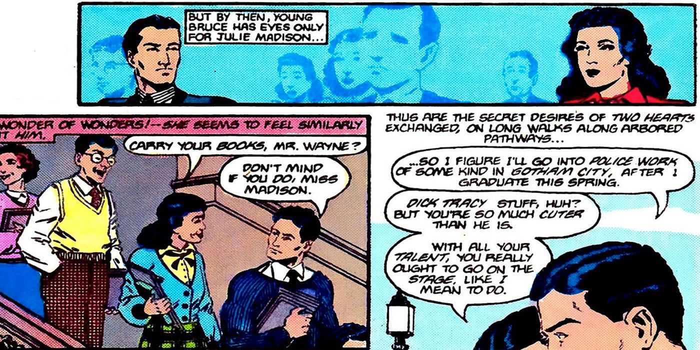 El primer amor de Bruce Wayne fue Julie Madison, una joven que podría estar en la universidad. Los dos se unieron por una pasión por la actuación, pero mientras Julie trataría de convertirse en una actriz de verdad, esta era una meta que Bruce nunca podría alcanzar, nunca tratando de llamar demasiado la atención sobre su vida civil.