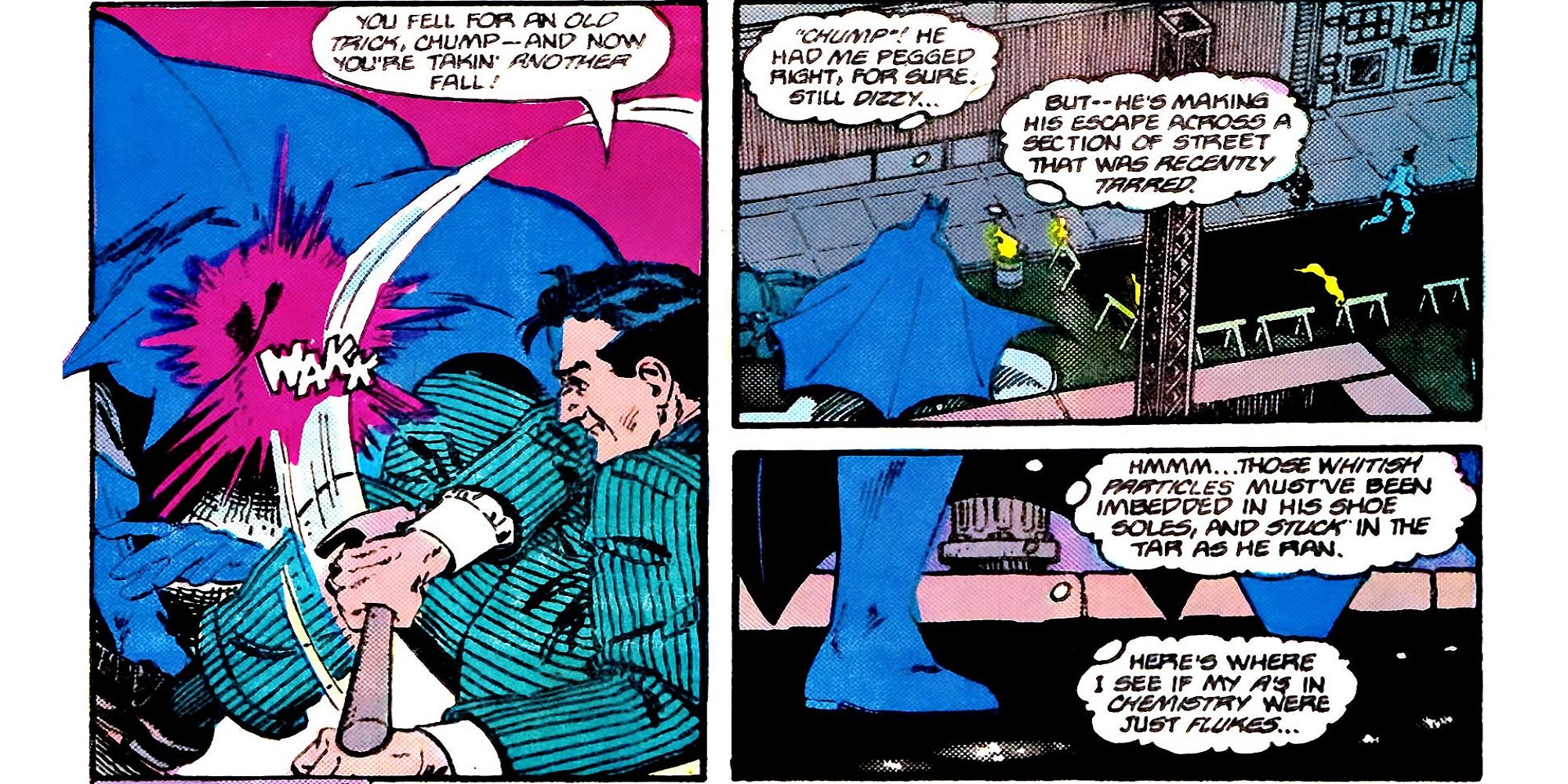 La primera vez que Bruce rastreó a un criminal no fue tan bien. El personaje trató de cazar a un ladrón común, y aunque fue capaz de capturarlo con bastante rapidez, esta versión de Bruce era bastante ingenua. El criminal fingió estar herido, y cuando Batman lo revisó, el criminal lo atacó y se escapó. El mismo criminal capturaría más tarde a Batman en una red y lo ataría, definitivamente no era un momento en el que el personaje pensaría con cariño.