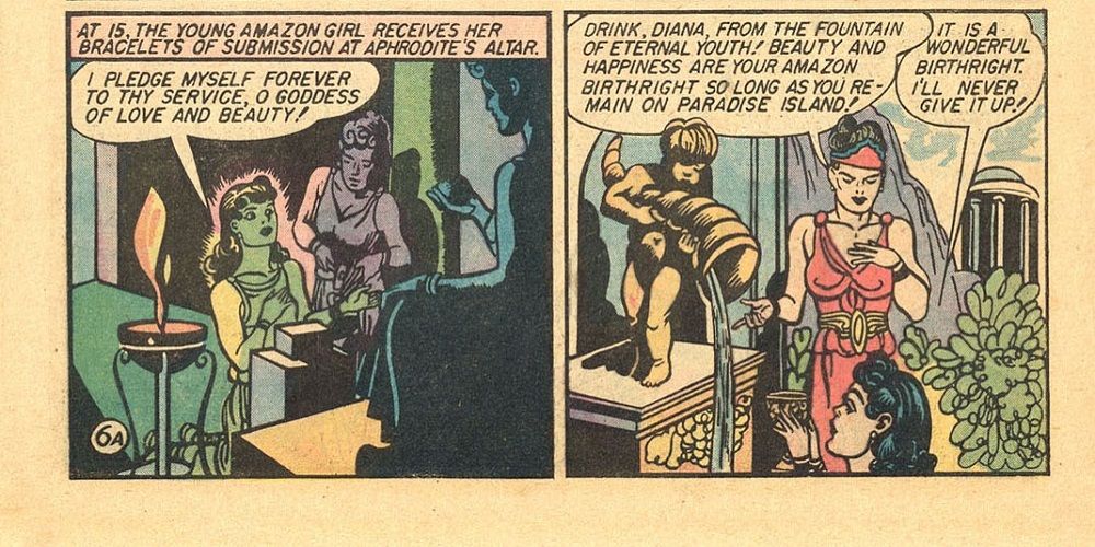 Diana Prince fue dotada con muchos dones de los dioses, pero uno que vino directamente de las Amazonas fue la falta de edad. La Isla Paraíso contenía una fuente de juventud que pertenecía a las Amazonas por derecho de nacimiento. Esto le permitía a Diana permanecer siempre joven... pero renunció a ella cuando decidió abandonar Isla Paraíso para irse con Steve Trevor.