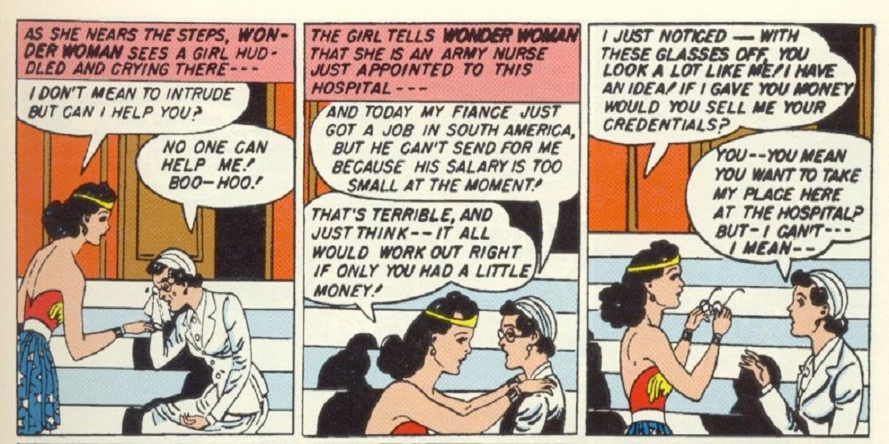 Tras traer a Steve Trevor de vuelta a América, la Mujer Maravilla se apresuró a dejarlo con los médicos para que se ocuparan de él. Volvería más tarde para ver cómo estaba, pero decidió tomar un disfraz. Se encontró con una enfermera que quería renunciar para poder ir a Sudáfrica a estar con su prometido, pero no podía permitírselo.