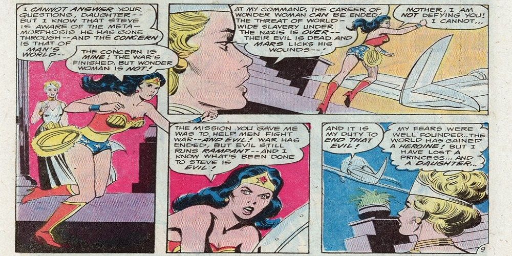 Después de ayudar a llevar a los aliados a la victoria, se esperaba que Diana regresara a Isla Paraíso. Pero cuando Steve Trevor se convirtió en un ser que debía combinar a toda la humanidad en una sola mente, Diana se negó a regresar hasta que su misión de salvar a Steve hubiera terminado, y su madre decidió no obligarla a quedarse. Con eso, Diana se marchó en su jet invisible, careciendo aún de la capacidad de volar en ese momento.