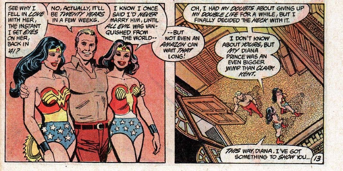 Tras la guerra, Diana aceptó seguir siendo la Mujer Maravilla hasta erradicar todo el mal del Mundo de los Hombres. También decidió que no se casaría con Steve Trevor hasta que lo hubiera hecho... pero esa promesa no se cumplió del todo. En su lugar, acabó casándose con Steve en las décadas posteriores a la guerra. Los dos disfrutaron de un matrimonio que duró veinte años antes de que se produjera la Crisis en Tierras Infinitas, borrando su Tierra por completo.
