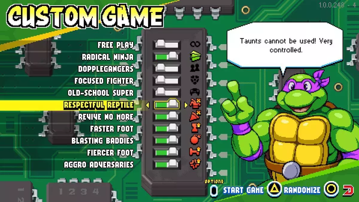 Las nuevas opciones de juego personalizadas del modo Arcade son igualmente ricas, y permiten a los jugadores emular el estilo de los beat-'em-ups de las Tortugas Ninja de Konami con una opción de juego libre, enemigos ninja del Clan del Pie más duros (¡que ahora pueden explotar al morir!), y supers de la vieja escuela que drenan salud al usarlos.