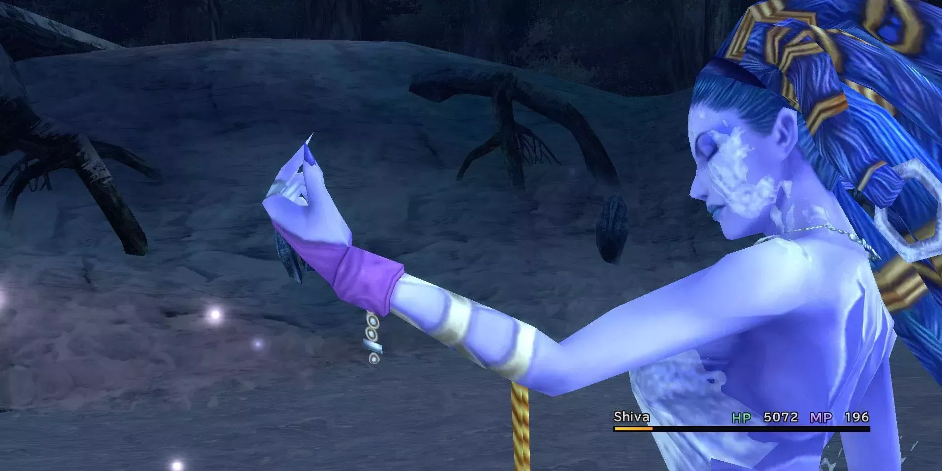 Shiva permaneció en el Templo de Macalania a la espera de invocadores en peregrinación para pedir ayuda para derrotar al Pecado. En FFX, Shiva es quizás más conocida por su animación Polvo de Diamante, en la que congela a un enemigo y luego lo destroza con un chasquido de dedos. En versiones posteriores de FFX, también se puede luchar contra versiones oscuras de superjefes de los Eones, incluida Shiva.