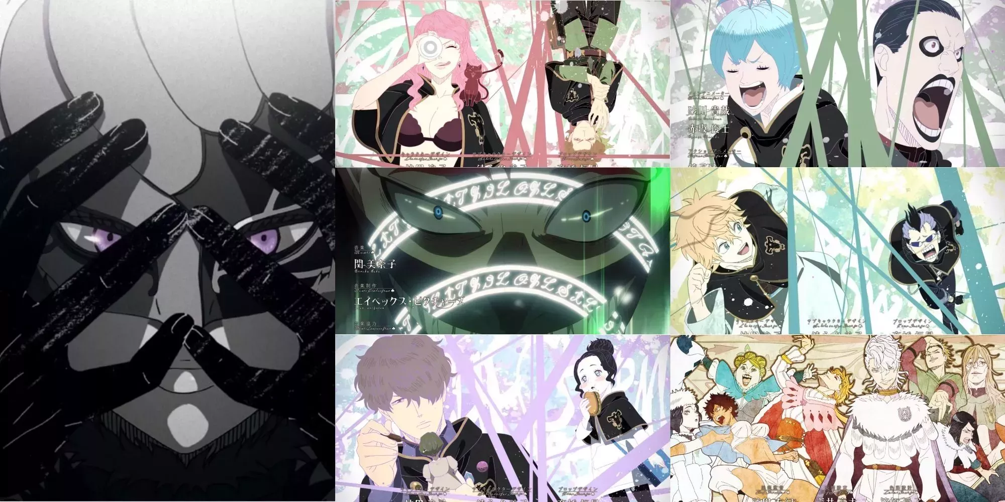 Black Clover incorpora con frecuencia nuevos elementos de apertura y cierre. Cada uno de ellos está muy adaptado a los acontecimientos de cualquier arco argumental, y las letras de las canciones añaden profundidad a los elementos visuales de la introducción, que presagian o insinúan lo que se puede esperar de los próximos episodios. Es como un anticipo.