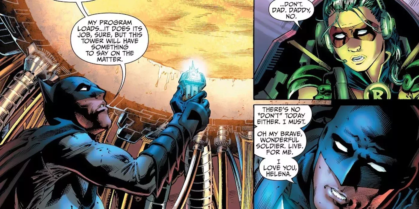 Por desgracia, acabó siendo una misión suicida, como se reveló cuando las torres se autodestruyeron. Aunque logró su objetivo, Batman murió en las explosiones subsiguientes mientras hablaba con su hija Helena, que en ese momento ejercía de Robin.