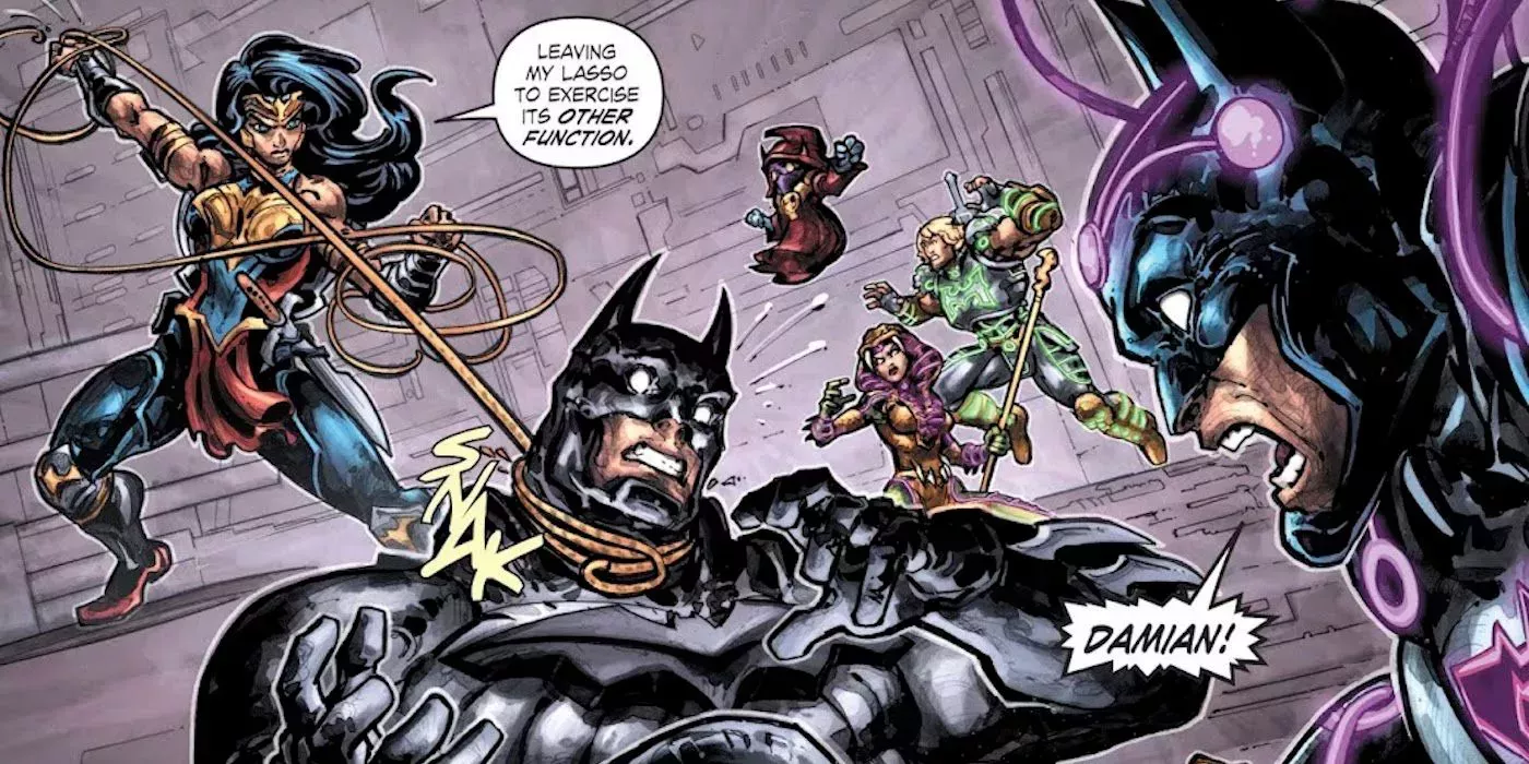 Por desgracia, Damian encontró su fin cuando intentó liberar a Bruce del centro de control de Superman y Wonder Woman utilizó su lazo para romperle el cuello. Esto sacó a Bruce de su trance y le llenó aún más de rabia mientras los rebeldes se retiraban y se reagrupaban.