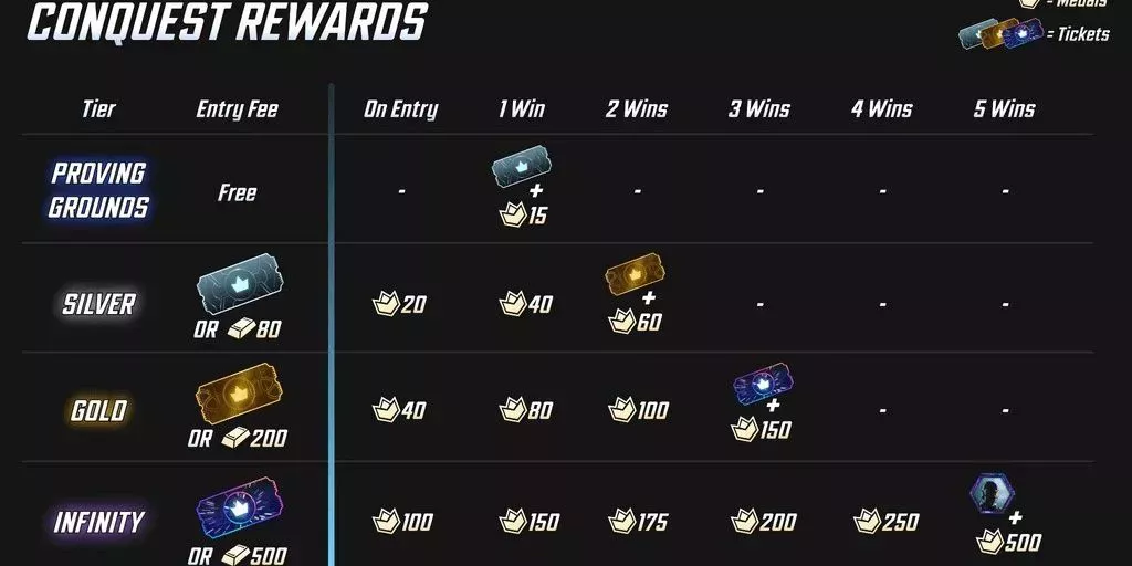 La Conquista de Plata es el siguiente paso, y requiere dos victorias consecutivas para conseguir un Billete de Oro y acceder al siguiente nivel. Siguiendo en la misma lÃnea, Conquista de oro es el siguiente paso y requiere tres victorias consecutivas, que conceden la entrada a la grande, Infinito. El nivel Infinito es donde se reunirán los mejores jugadores para conseguir las mayores recompensas, y como era de esperar requiere cinco victorias para completarlo.