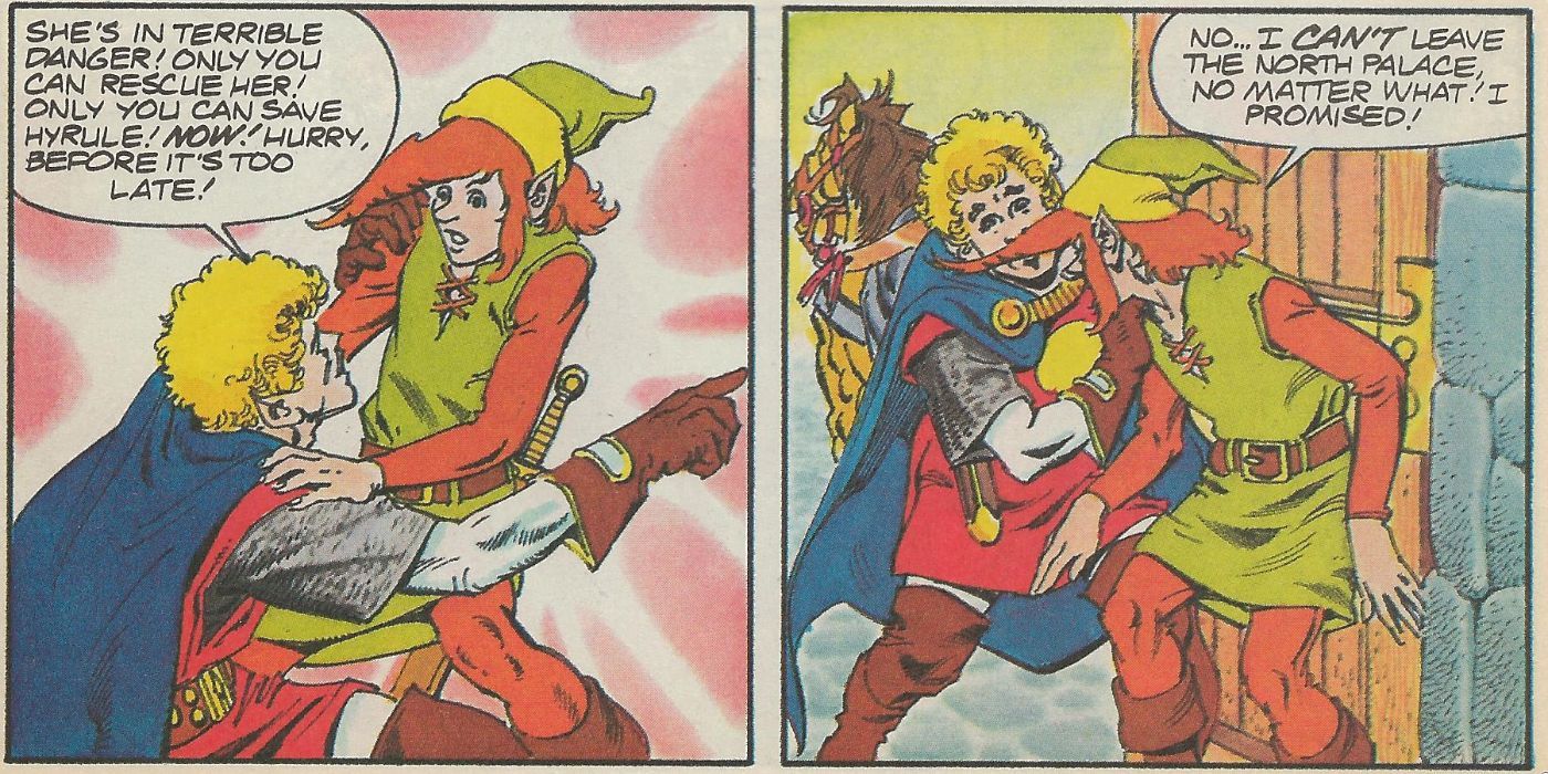 De hecho, en los cómics, Zelda es mucho más receptiva a los afectos de Link. En el número 3, en la página 6, le dice a Link: "Porque me amas... y yo te amo a ti". Y mientras el tropo de Link pidiéndole un beso se repite aquí también, las acciones de Zelda, es bastante claro, vienen de un lugar de amor.