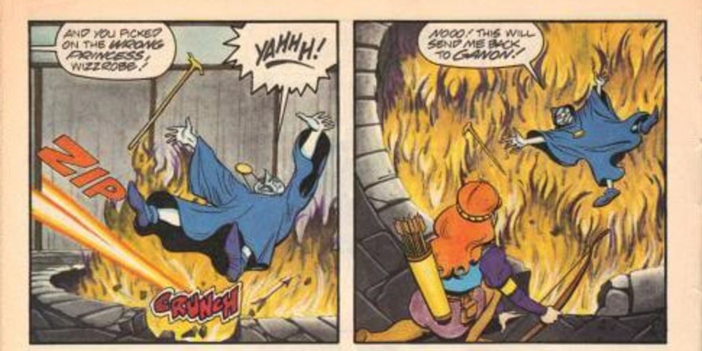 Cuando finalmente sale, se encuentra con la sorprendente visión de Link siendo atrapado por un Wizzrobe. Aún así, no rehuye el desafío y logra derrotar al Wizzrobe y salvar a Link.